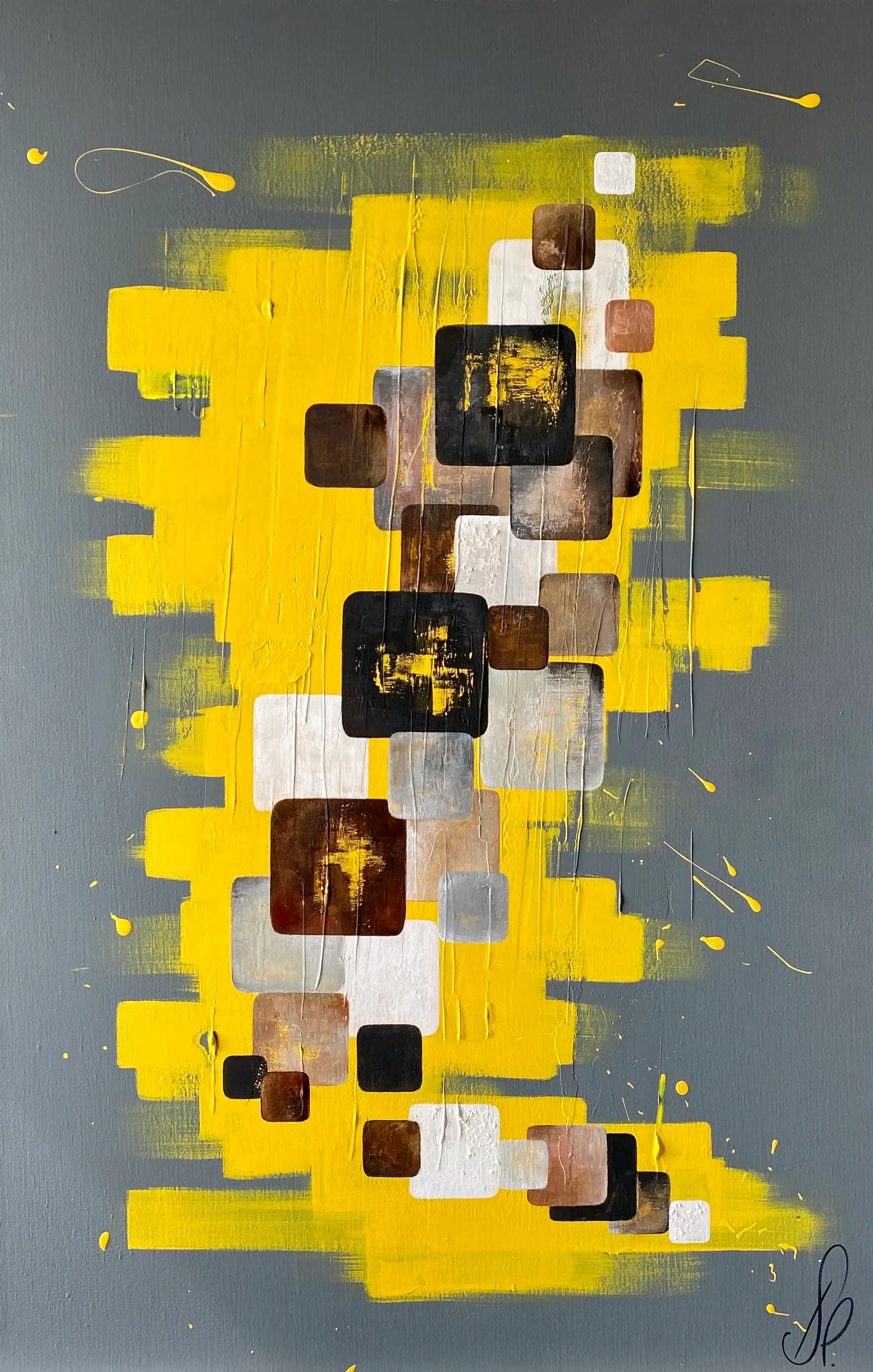 Abstraction audacieuse aux jaunes lumineux et contrastes profonds, cette œuvre énergisante capte le regard et insuffle une touche de caractère moderne à tout espace.